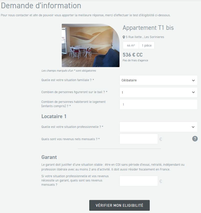 Sur la page du logement qui vous intéresse, testez votre éligibilité via notre simulateur afin de vérifier votre solvabilité. Vous y accédez en cliquant sur le bouton demande d'information.