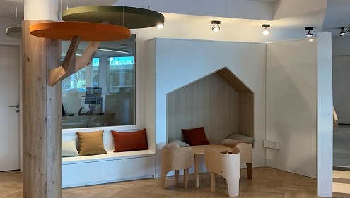 Nous avons même pensé à vos enfants qui ont leur propre espace dédié. Avec des jeux mis à leur disposition (puzzles, voitures, …) ils auront de quoi s’occuper pendant vos choix de prestations pour votre futur logement ou vos rendez-vous. La niche en forme de toit est un clin d’œil à l’univers de l’habitat et le mur en ardoise effaçable, une toile où vos enfants pourront dessiner et imaginer leur futur chez eux.